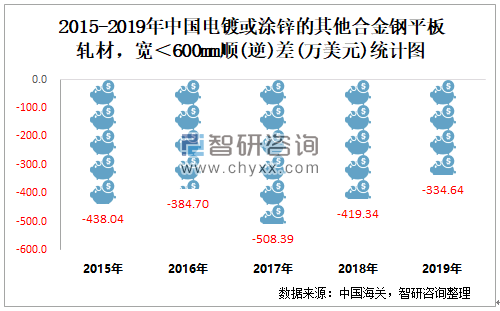 2015-2019年中国电镀或涂锌的其他合金钢平板轧材,宽<600MM顺(逆)差统计图