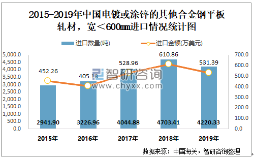 根据中国海关数据显示:2015-2019年中国电镀或涂锌的其他合金钢平板轧材,宽<600mm进口数量与进口金额均在2018年达到最高值;2015-2019年中国电镀或涂锌的其他合金钢平板轧材,宽<600mm出口金额逐年递增。