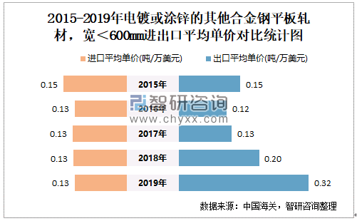 2015-2019年中国电镀或涂锌的其他合金钢平板轧材,宽<600MM进出口平均单价对比统计图