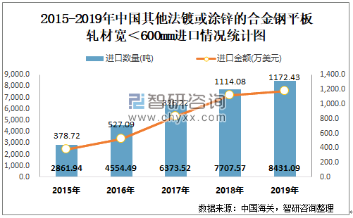 根据中国海关数据显示:2015-2019年中国其他法镀或涂锌的合金钢平板轧材宽<600mm进口数量与进口金额逐年递增;2015-2019年中国其他法镀或涂锌的合金钢平板轧材宽<600mm出口金额在2100-2800万美元间波动,出口数量2018年达到最高值。