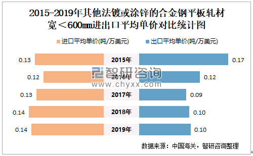 2015-2019年中国其他法镀或涂锌的合金钢平板轧材宽<600MM进出口平均单价对比统计图
