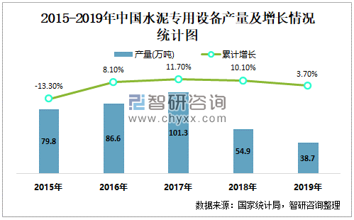 2015-2019年中国水泥专用设备产量及增长情况统计图
