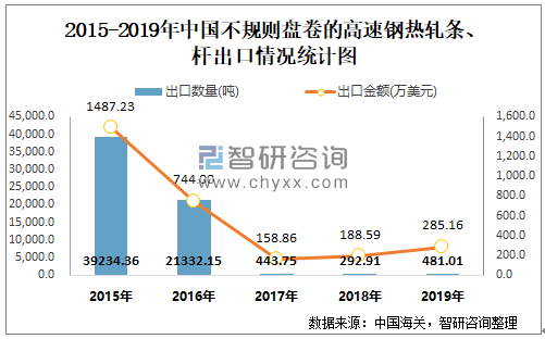 2015-2019年中国不规则盘卷的高速钢热轧条、杆出口情况统计图