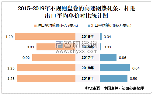 2015-2019年中国不规则盘卷的高速钢热轧条、杆进出口平均单价对比统计图