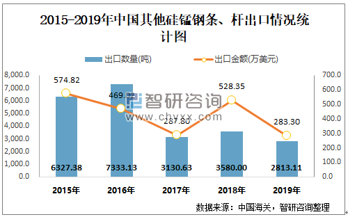根据中国海关数据显示:2015-2019年中国其他硅锰钢条、杆进口数量与进口金额均在2018年跌至最低值,此后呈现上升趋势;2015-2019年中国其他硅锰钢条、杆出口金额在280-580万美元间波动,2015年达到最高值。