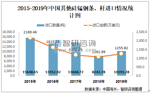 根据中国海关数据显示:2019年1-12月中国其他硅锰钢条、杆进口数量为10191.28吨,进口金额为1255.82万美元;2019年1-12月其他硅锰钢条、杆出口数量为2813.11吨,出口金额为283.3万美元。