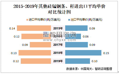 2015-2019年中国其他硅锰钢条、杆进出口平均单价对比统计图
