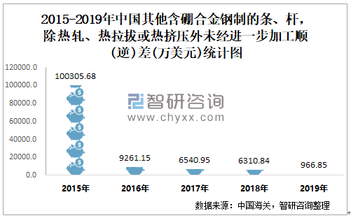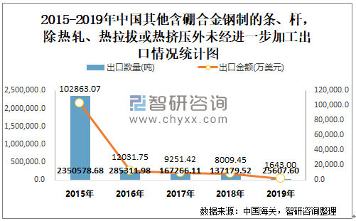 根据中国海关数据显示:2015-2019年中国其他含硼合金钢制的条、杆,除热轧、热拉拔或热挤压外未经进一步加工进口数量与进口金额呈现下降趋势;2015-2019年中国其他含硼合金钢制的条、杆,除热轧、热拉拔或热挤压外未经进一步加工出口数量与出口金额逐年递减,下降幅度较大。