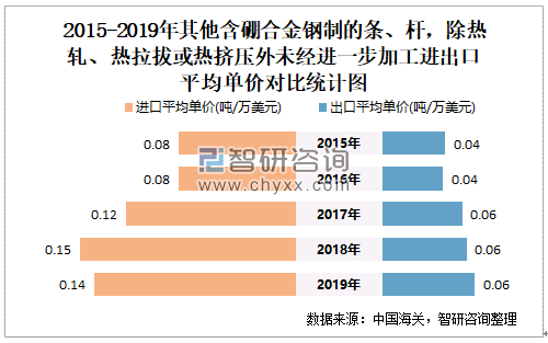 2015-2019年中国其他含硼合金钢制的条、杆,除热轧、热拉拔或热挤压外未经进一步加工进出口平均单价对比统计图