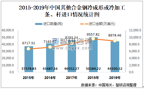 根据中国海关数据显示:2019年1-12月中国其他合金钢冷成形或冷加工条、杆进口数量为44330.52吨,进口金额为8978.46万美元;2019年1-12月其他合金钢冷成形或冷加工条、杆出口数量为59490.26吨,出口金额为6870.4万美元。