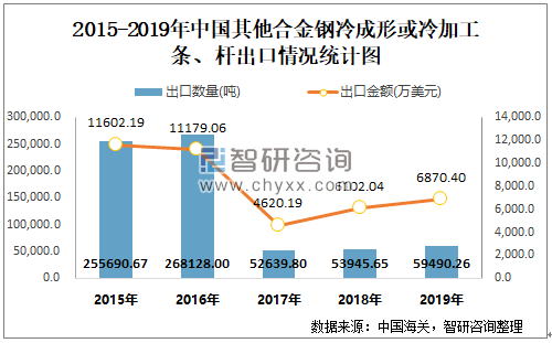 2015-2019年中国其他合金钢冷成形或冷加工条、杆出口情况统计图