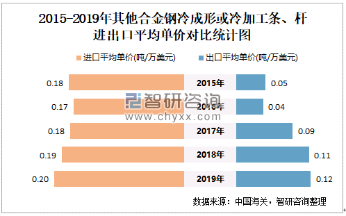 2015-2019年中国其他合金钢冷成形或冷加工条、杆进出口平均单价对比统计图