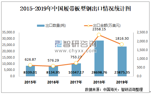 根据中国海关数据显示:2015-2019年中国履带板型钢进口金额逐年递增,2019年上涨幅度较大;2015-2019年中国履带板型钢出口数量与出口金额均在2018年达到最高值。
