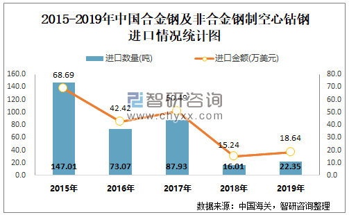 根据中国海关数据显示:2019年1-12月中国合金钢及非合金钢制空心钻钢进口数量为22.35吨,进口金额为18.64万美元;2019年1-12月合金钢及非合金钢制空心钻钢出口数量为4024.86吨,出口金额为603.3万美元。