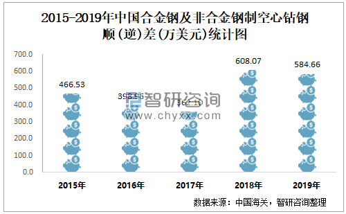 2015-2019年中国合金钢及非合金钢制空心钻钢顺逆差统计图