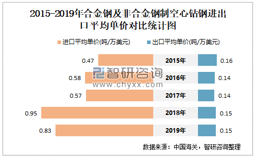 2015-2019年中国合金钢及非合金钢制空心钻钢进出口平均单价对比统计图