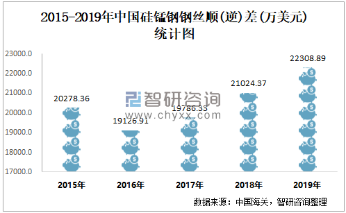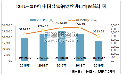 根据中国海关数据显示:2019年1-12月中国硅锰钢钢丝进口数量为16911.17吨,进口金额为3513.23万美元;2019年1-12月硅锰钢钢丝出口数量为266089.14吨,出口金额为25822.12万美元。