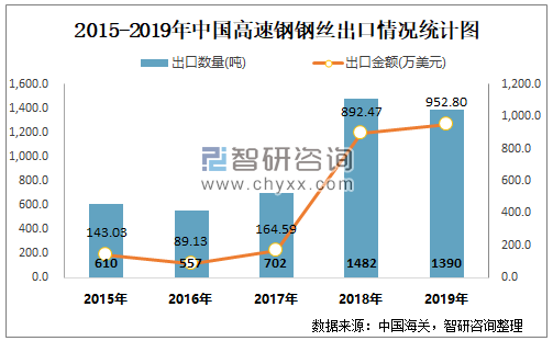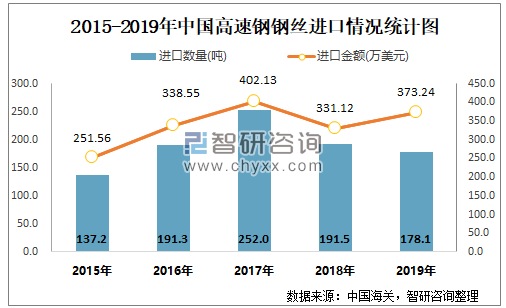 根据中国海关数据显示:2015-2019年中国高速钢钢丝进口数量2017年达到最高值,此后逐年递减;2015-2019年中国高速钢钢丝出口金额至2016年后逐年递增。