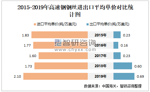 2015-2019年中国高速钢钢丝进出口平均单价对比统计图