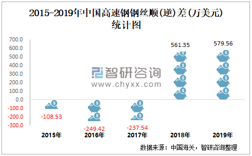 2015-2019年中国高速钢钢丝顺逆差统计图