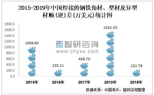 2015-2019年中国焊接的钢铁角材、型材及异型材顺逆差统计图