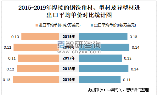 2015-2019年中国焊接的钢铁角材、型材及异型材进出口平均单价对比统计图