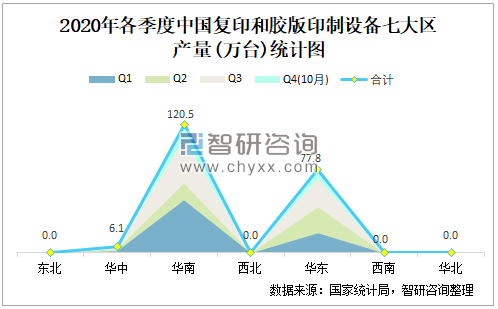 根据国家统计局数据显示:2020年各季度(第4季度暂只统计10月数据)中国复印和胶版印制设备主要集中在华南、华东地区生产;2020年1-10月中国复印和胶版印制设备产量大区分布不均衡,其中华南地区产量最高,特别是广东省接近整个华南地区的产量;2020年1-10月中国复印和胶版印制设备只有少量省市有生产,各省市产量top1遥遥领先于其他省市,广东、江苏、上海等省市产量最多。