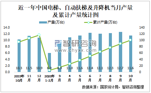 根据国家统计局数据显示:2020年10月中国电梯、自动扶梯及升降机产量为11.6万台,同比增长12.6%;2020年1-10月中国电梯、自动扶梯及升降机累计产量为100.9万台,累计增长5.4%;2015-2019年中国电梯、自动扶梯及升降机产量逐年递增,2019年达到最高。