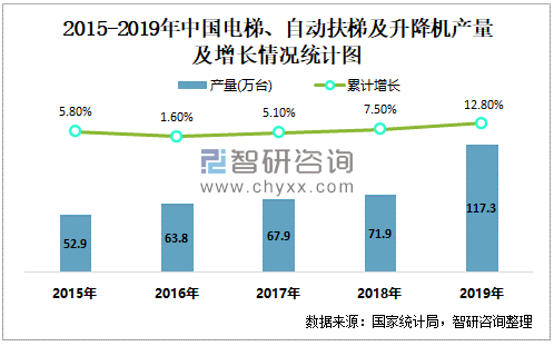 2015-2019年中国电梯、自动扶梯及升降机产量及增长情况统计图