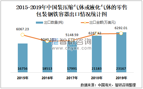 根据中国海关数据显示:2019年1-12月中国装压缩气体或液化气体的零售包装钢铁容器进口数量为219.42吨,进口金额为240.79万美元;2019年1-12月装压缩气体或液化气体的零售包装钢铁容器出口数量为23166.76吨,出口金额为6292.01万美元。