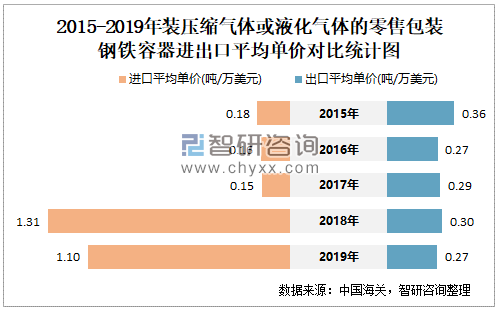2015-2019年中国装压缩气体或液化气体的零售包装钢铁容器进出口平均单价对比统计图