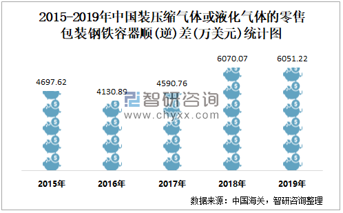 2015-2019年中国装压缩气体或液化气体的零售包装钢铁容器顺逆差统计图