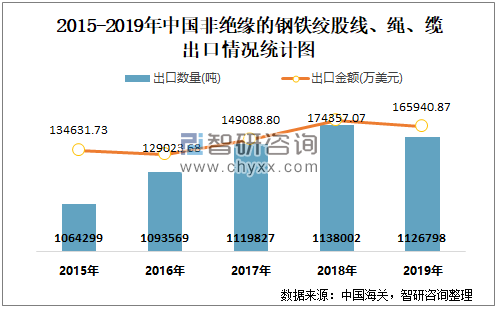根据中国海关数据显示:2019年1-12月中国非绝缘的钢铁绞股线、绳、缆进口数量为55970.25吨,进口金额为21753.02万美元;2019年1-12月非绝缘的钢铁绞股线、绳、缆出口数量为1126797.78吨,出口金额为165940.87万美元。