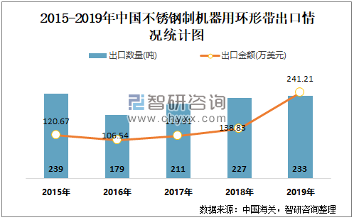 根据中国海关数据显示:2015-2019年中国不锈钢制机器用环形带进口数量与进口金额至2017年后呈现下降趋势;2015-2019年中国不锈钢制机器用环形带出口数量与出口金额近4年逐年递增。