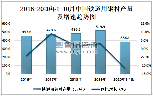 2016-2020年1-10月中国铁道用钢材产量及增速趋势图