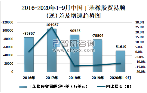2016-2020年1-9月中国丁苯橡胶贸易顺(逆)差及增速趋势图