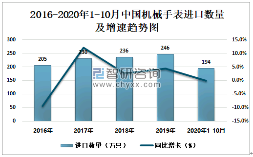 2016-2020年1-10月中国机械手表进口数量及增速趋势图
