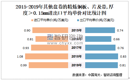 2015-2019年中国其他盘卷的精炼铜板、片及带,厚度>0.15MM进出口平均单价对比统计图