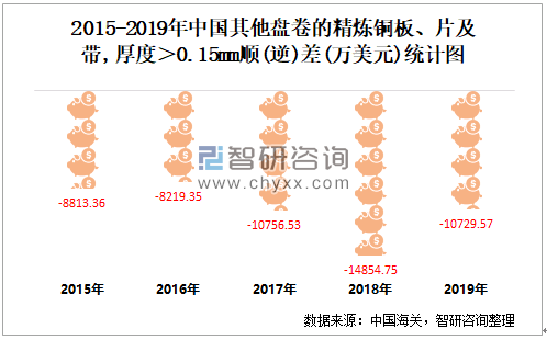 2015-2019年中国其他盘卷的精炼铜板、片及带,厚度>0.15MM顺(逆)差统计图