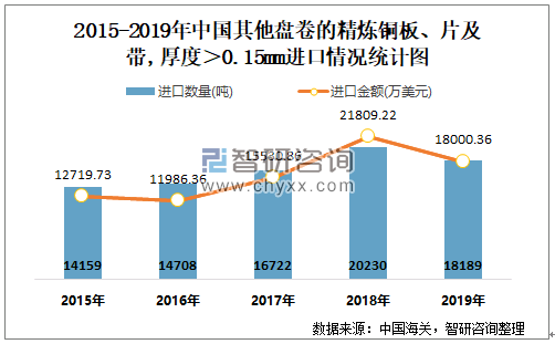 根据中国海关数据显示:2019年1-12月中国其他盘卷的精炼铜板、片及带,厚度>0.15mm进口数量为18189.03吨,进口金额为18000.36万美元;2019年1-12月其他盘卷的精炼铜板、片及带,厚度>0.15mm出口数量为8936.19吨,出口金额为7270.79万美元。