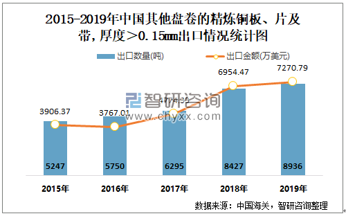 根据中国海关数据显示:2015-2019年中国其他盘卷的精炼铜板、片及带,厚度>0.15mm进口数量与进口金额均在2018年达到最高值;2015-2019年中国其他盘卷的精炼铜板、片及带,厚度>0.15mm出口数量与出口金额近4年逐年递增。