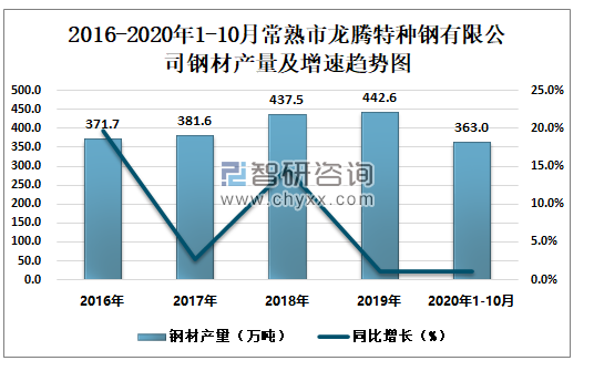 2016-2020年1-10月常熟市龙腾特种钢有限公司钢材产量及增速趋势图