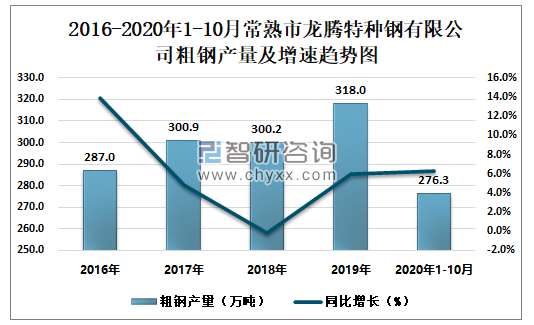 2016-2020年1-10月常熟市龙腾特种钢有限公司粗钢产量及增速趋势图