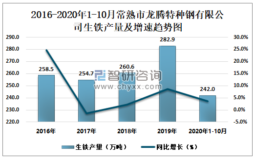 2016-2020年1-10月常熟市龙腾特种钢有限公司生铁产量及增速趋势图