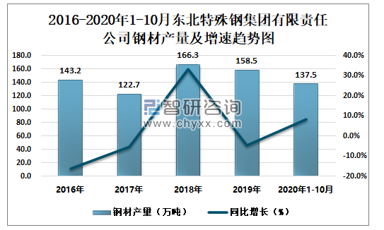 2016-2020年1-10月东北特殊钢集团有限责任公司钢材产量及增速趋势图