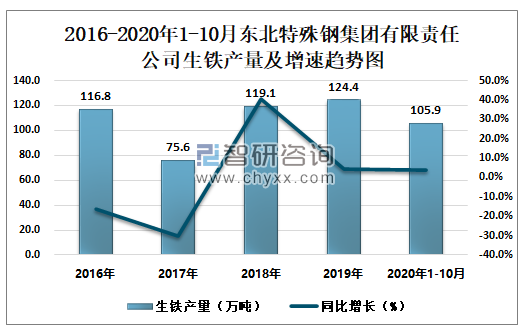 2016-2020年1-10月东北特殊钢集团有限责任公司生铁产量及增速趋势图