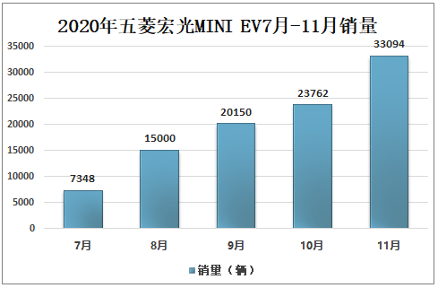 2020年7月五菱宏光MINI EV销量为7348辆,2020年11月五菱宏光MINI EV销量达到33094辆。