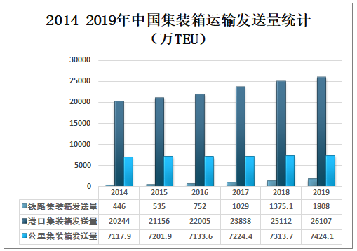 近年来中国集装箱运输市场高速发展,2019年我国铁路集装箱发运量约为1808万TEU,铁路集装箱发运量同比增长31.48%;2019年我国港口集装箱吞吐量为26107万TEU,港口集装箱吞吐量同比增长3.96%;2019年我国公路集装箱运输量为7424.1万TEU公路集装箱运输量同比增长1.51%。