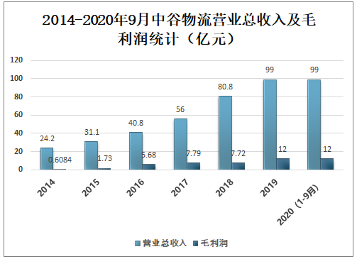 中谷物流股份有限公司以集装箱为核心载体,优质服务领跑物流行业。中谷物流股份有限公司主要从事内贸集装箱物流行业,以其优质服务领跑中国物流行业。公司以客户需求为核心,以服务实体经济为宗旨,整合水路、公路、铁路运输资源协同协作,依托现代化的物流信息平台,致力于为客户提供定制化、高性价比的“门到门”全程集装箱物流解决方案。近年来中谷物流营业总收入及毛利润逐年增加,2020年1-9月中谷物流营业总收入已完成99亿元,毛利润达12亿元。
