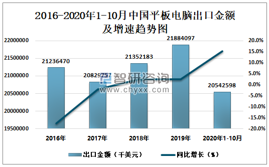 根据中国海关数据显示:2020年1-10月中国平板电脑出口数量为10482万台,同比增长19.1%;2020年1-10月中国平板电脑出口金额为20542598千美元,同比增长15.3%。